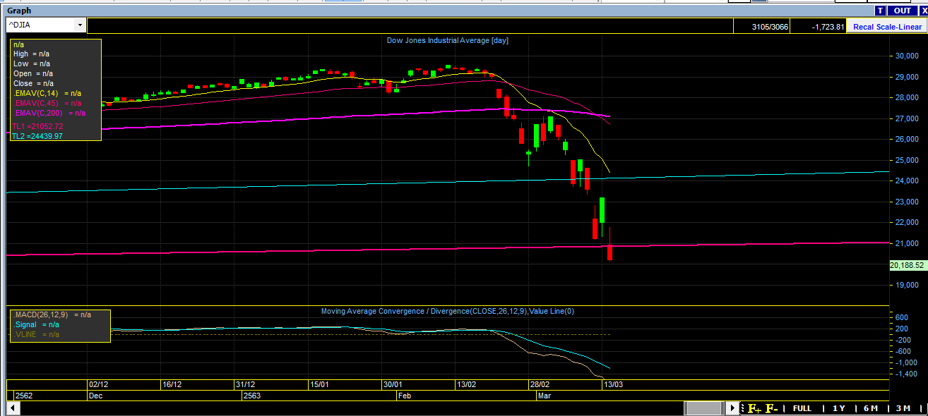ดาวโจนส์หลุดเทรนไลน์ในรอบ 12 ปี เรียบร้อย ในขณะที่มาตรการลดดอกเบี้ยใช้ไปหมดแล้ว เหลือแต่อัด QE อย่างเดียว