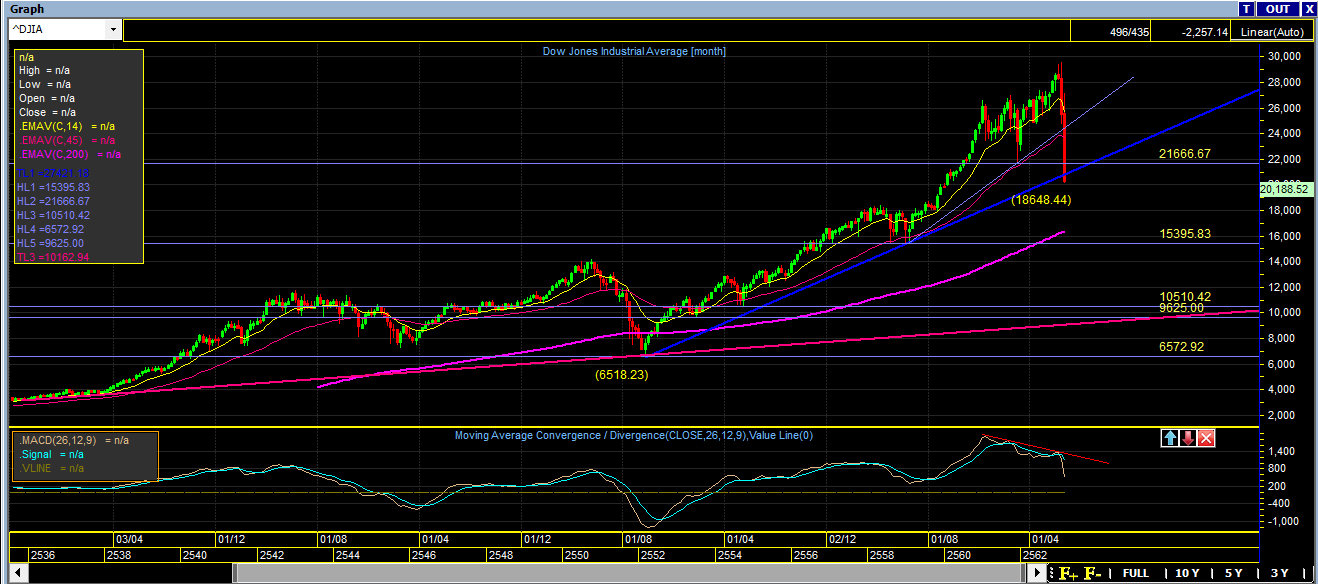 กราฟดาวโจนส์แทงเดือน ย้อนกลับไป 30 กว่าปี ไม่มีช่วงไหนที่ตลาดหุ้นดาวโจนส์ใช้เวลาตก 2 เดือนเยอะขนาดนี้ เหมือนลงลิฟต์ด่วนเลย