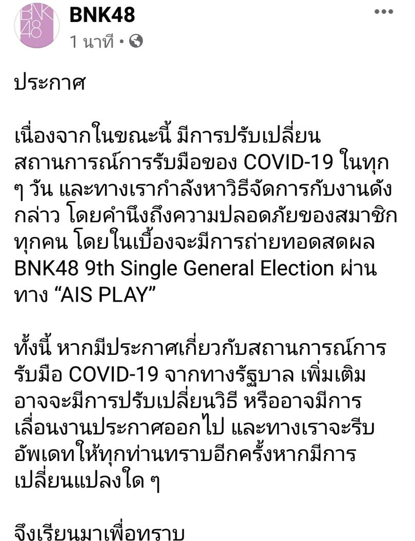 BNK48 และ AIS Play ได้มาย้ำเตือนแฟนๆอีกรอบสำหรับการถ่ายทอดสดงาน BNK48 9th Single Senbatsu General Election ที่จะมีขึ้นในวันอาทิตย์ที่ 19 เมษายน 2563 นี้ โดยขอย้ำว่าการถ่ายทอดสดทาง AIS Play ในวันอาทิตย