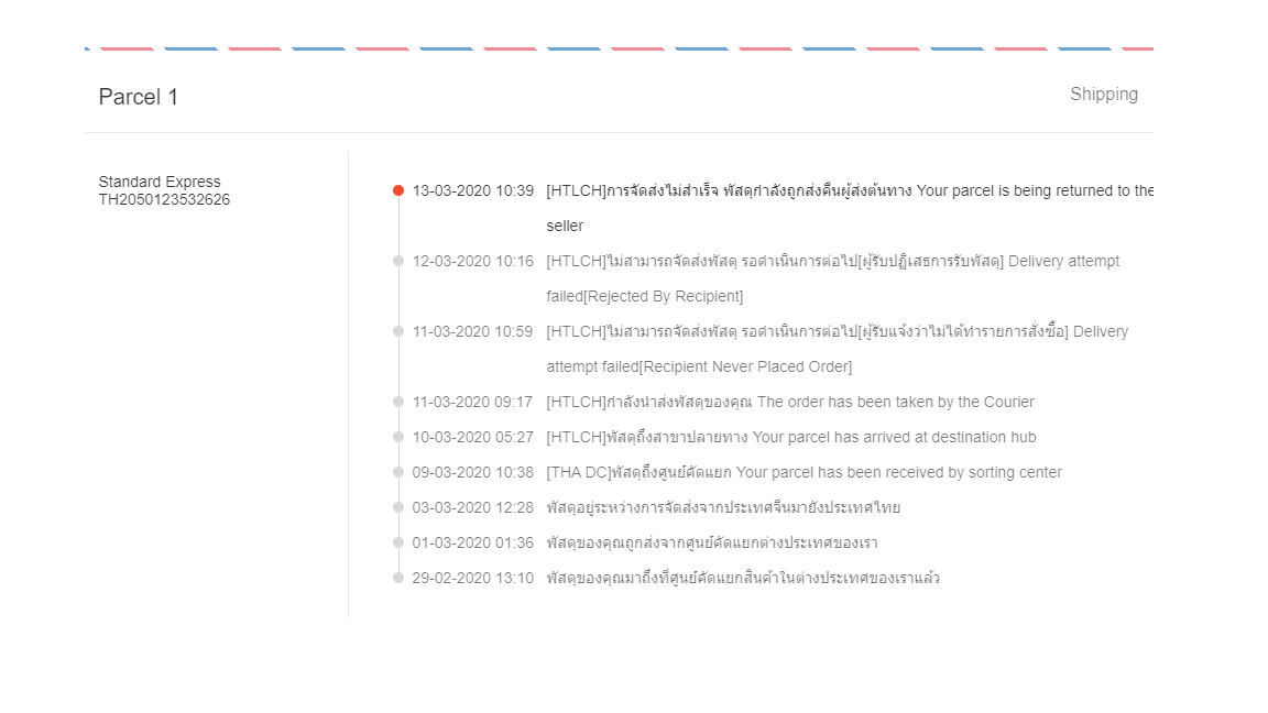 วันแรกที่ติดตามพัสดุ บอกว่าผู้รับทำการปฏิเสธไม่ได้ทำรายการสั่งซื้อ