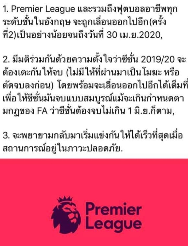 "พรีเมียร์ ลีก" ยืดพักแข่งถึง 30 เม.ย. ยันฤดูกาล 2019-20 ต้องจบบริบูรณ์