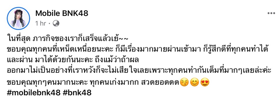 คำขอบคุณ จากโมบายล์ BNK48 Champ Of The Week ใน App IAM48