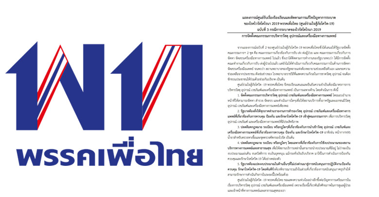 พรรคเพื่อไทยออกแถลงการณ์ศูนย์รับเรื่องร้องเรียนและติดตามการแก้ไขปัญหาการระบาด ของโรคไวรัสโคโรนา 2019
