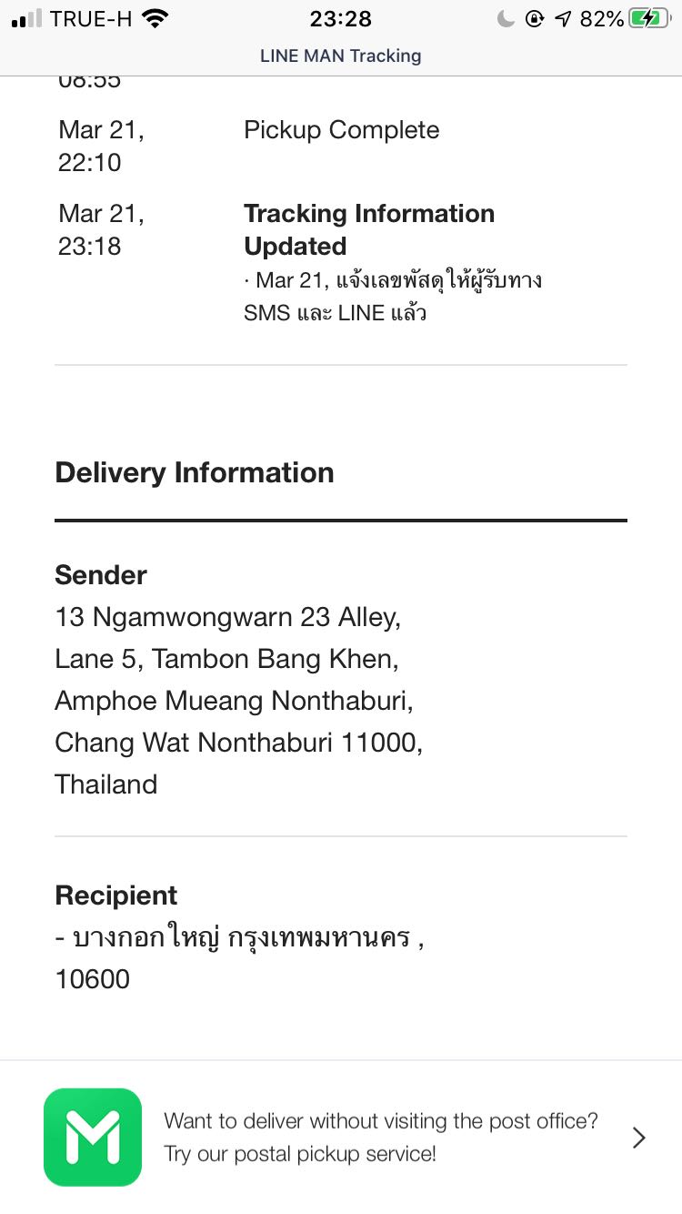 เรียกไลน์แมนมารับพัสดุที่บ้านไปส่งไปรษณีย์ได้มั้ยคะ อยู่ตจว.
