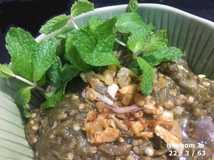 อาหารการกินที่บ้านเราเช้านี้มีของที่กักตุนไว้พอจะนำมาทำเมนูได้บ้าง มี ต๋ำบ่าเขือ ปลาซาบะย่าง เนื้ออกไก่ตุ๋นยาจีน ต้มไข่น้ำ ของโปรดไม่พ้นต๋ำบ่าเขือ ที่นำมะเขือ หอมกระเทียมพริกมาย่างไฟแกะเปลือกนำมาตำรวมกันใส่เกลือปรุงรส หาใบสะระแหน่มาแนมให้คุณค่าทางโภชนาการมากมายโดยเฉพาะใบมิ้นท์หอมเย็นตัดไข่ต้มเป็นซีกกินด้วยกันก็อร่อยไปอีกแบบ