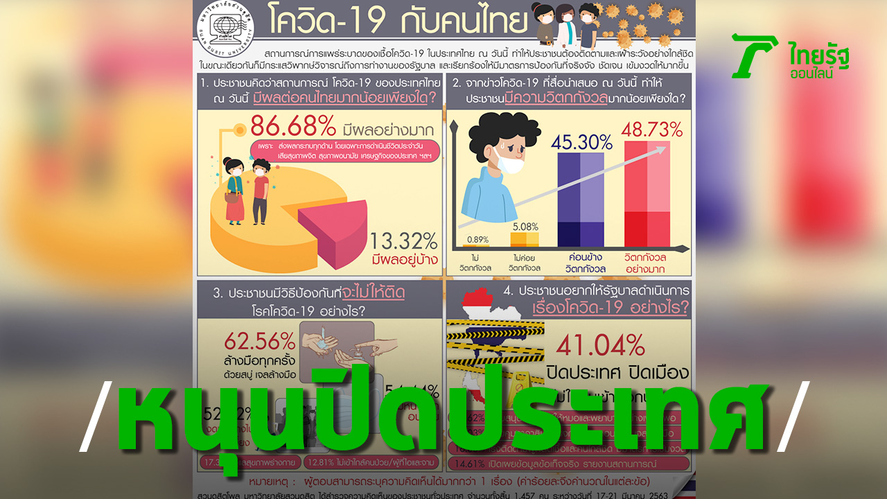 โพลสวนดุสิต ชี้คนกว่า 86% ระบุชัดโควิด-19 ส่งผลกระทบทุกด้าน ทำวิตกกังวลมาก ทั้งเสียสุขภาพจิต ทางแก้ไขล้างมือด้วยน้ำสบู่หรือเจลล้างมือ ขณะคนส่วนใหญ่ หนุน ปิดประเทศ ปิดเมือง ไม่ให้คนเข้าออกประเทศ