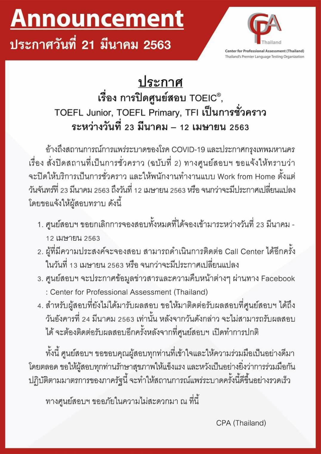 ประกาศปิดศูนย์สอบ TOEIC ระหว่างวันที่ 23 มีนาคม - 12 เมษายน 2563