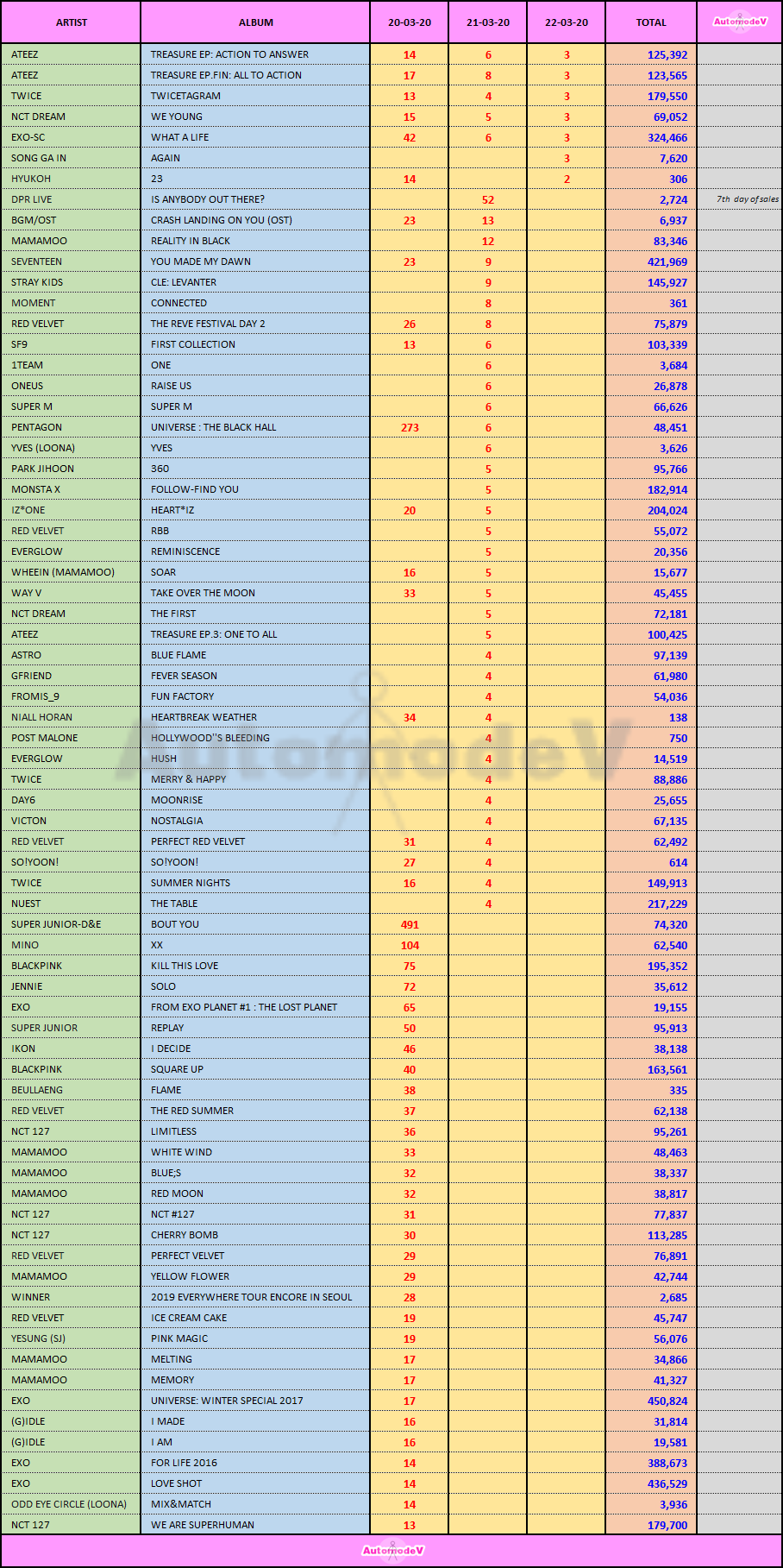 ยอดซื้ออัลบั้มจากชาร์ต HANTEO 20 - 22 มีนาคม 2563