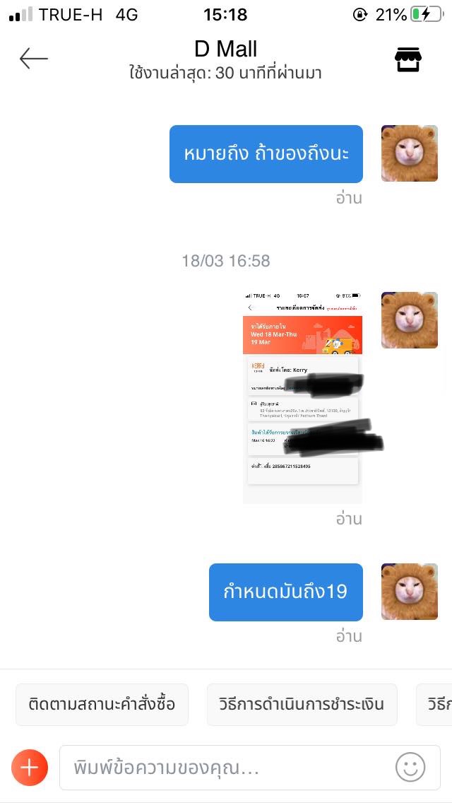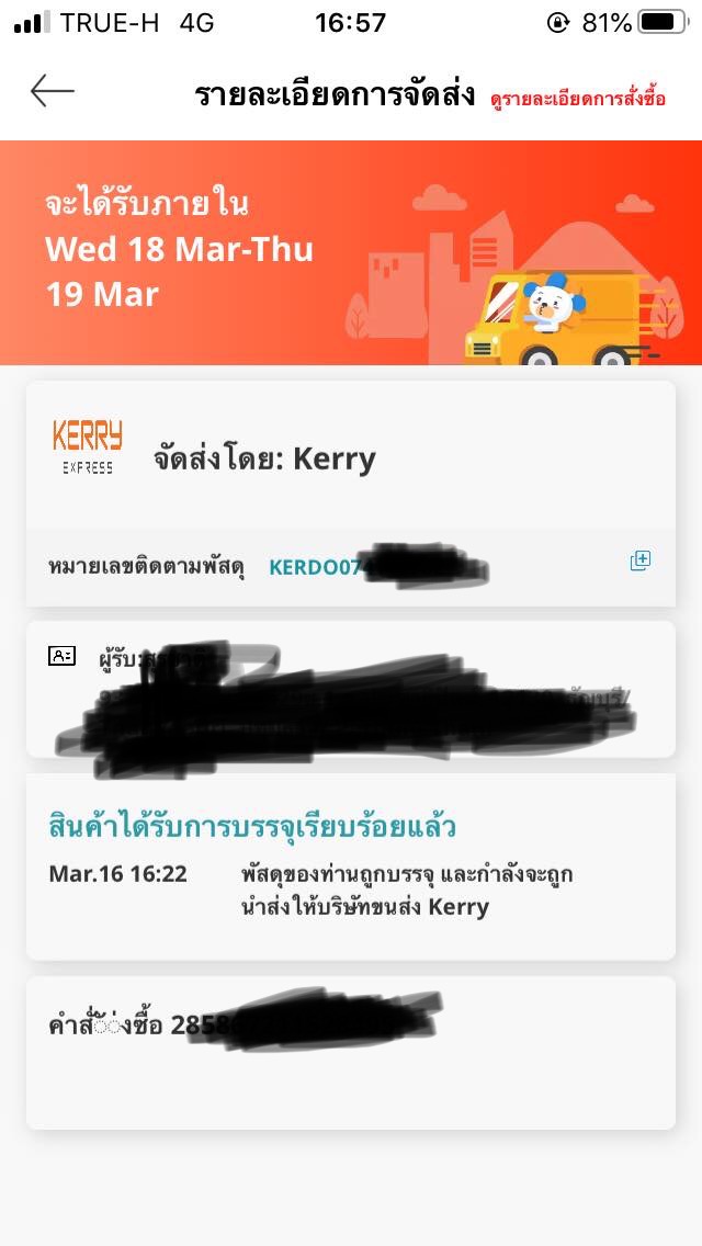 เลยกดสั่งเลยพร้อมชำระเงิน(วันอาทิตย์ที่15 มีนาคม) พอชำระเงินปุ๊บ ร้านค้า เปลี่ยนสถานะว่า (พัสดุของท่านถูกบรรจุและกำลังจะถูกนำส่งให้kerry จะถึงภายใน18-19