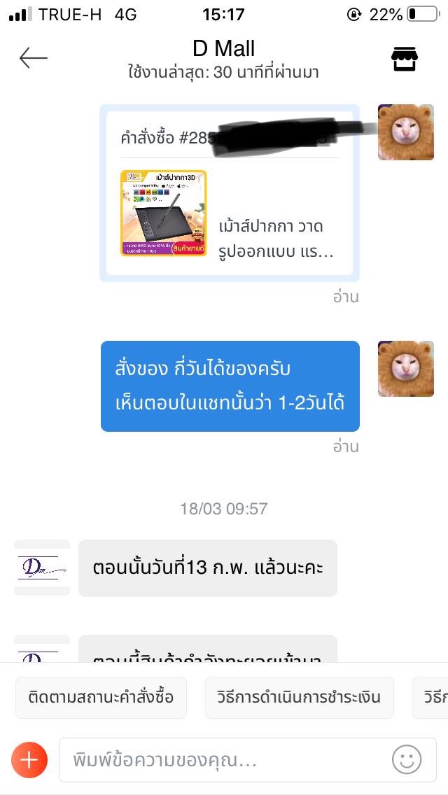 สั่งของ ประมาณกี่วันได้ ร้านค้าก็ตอบมาว่า 1-2วัน เราเห็นว่า ร้านค้าตอบเร็ว คงโอเค(ซึ่งภายหลังไม่โอเค)