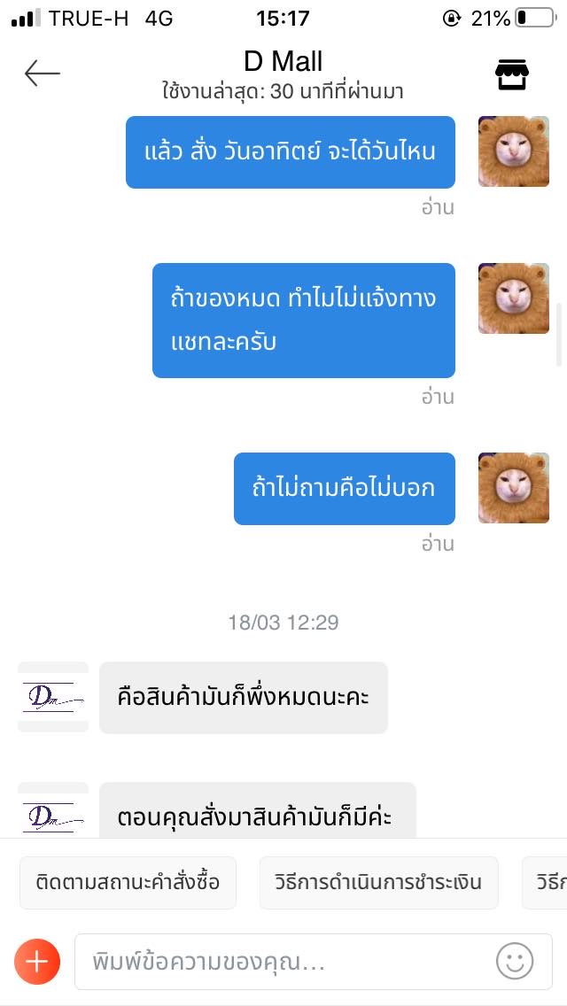 เราเลยถามไปใหม่ว่า 'สั่งของวันอาทิตย์(วันที่15) จะได้วันไหน ถ้าของหมดทำไมไม่แจ้ง ไม่ถามคือไม่บอก