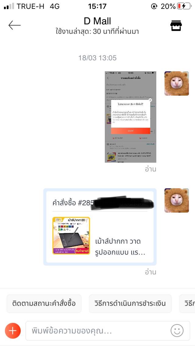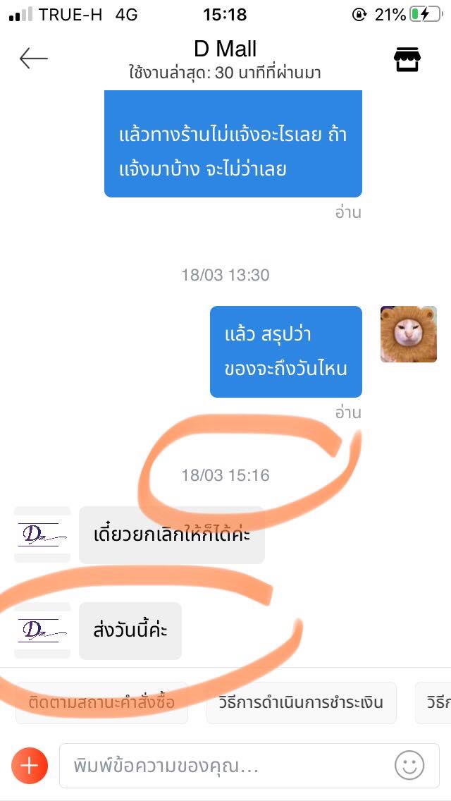 ซึ่งทางเราตอบไปว่า มันยกเลิกไม่ได้ เพราะร้านค้าขึ้นสถานะสิ่งของว่า กำลังจัดส่ง(ทั้งๆที่ยังไม่ส่ง)