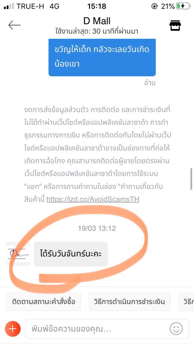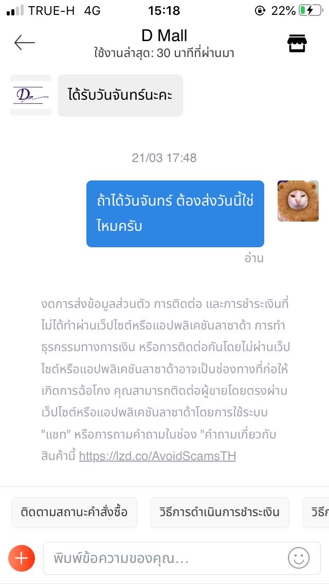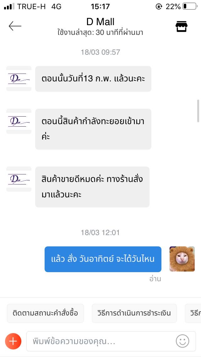 เราก็โอเค รอ~ ไปอีก จนวันเสาร์ ทักไปตอน5โมงเย็นว่า ถ้าถึงวันจันทร์ ต้องส่งวันนี้ใช่มั้ย ร้านค้าก็มาอ่าน แต่ไม่ตอบเหมือนเดิม