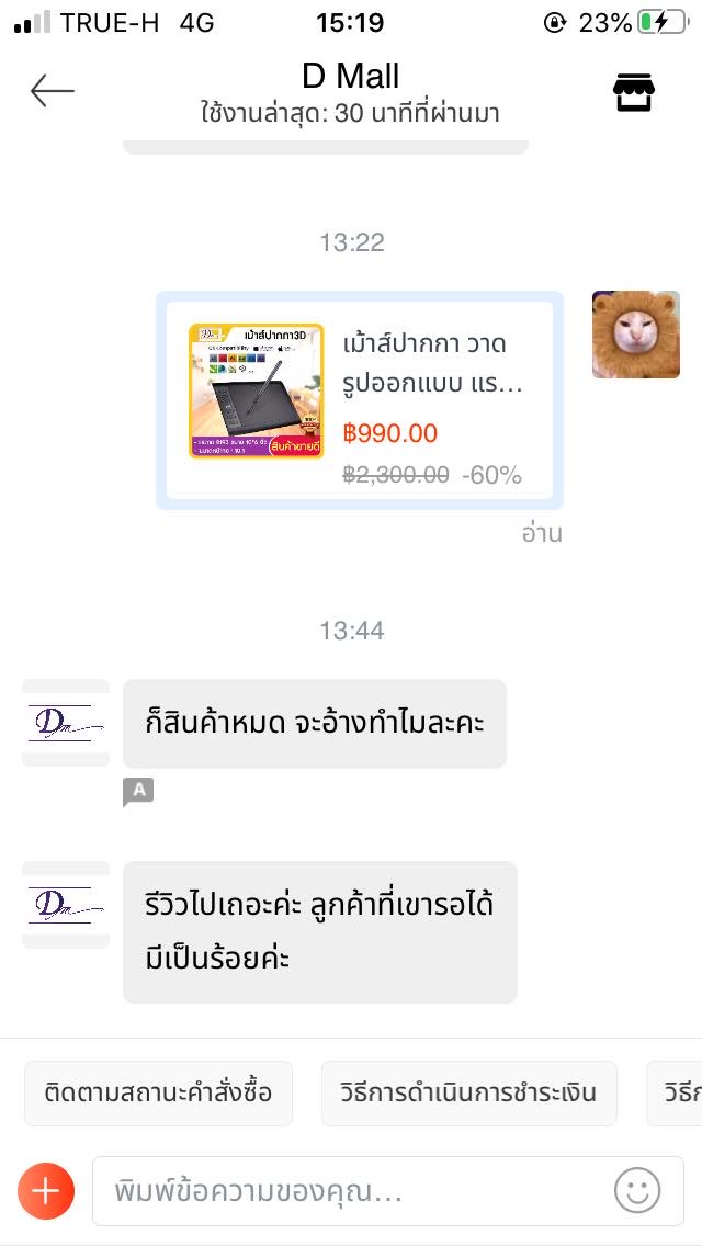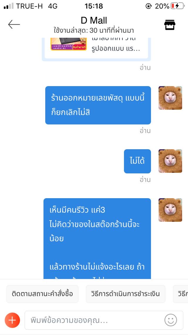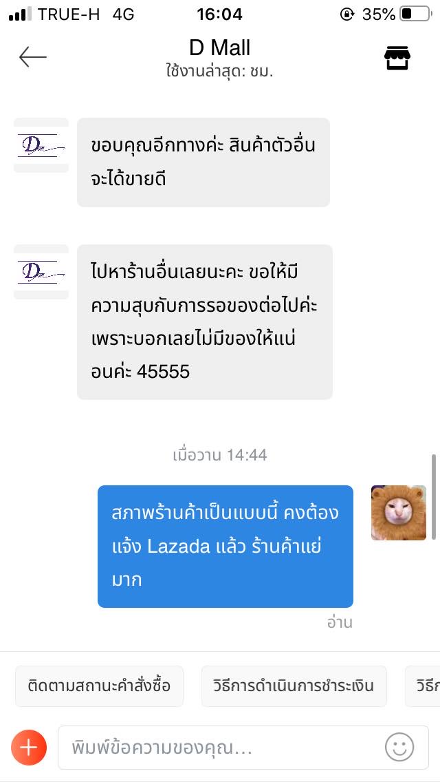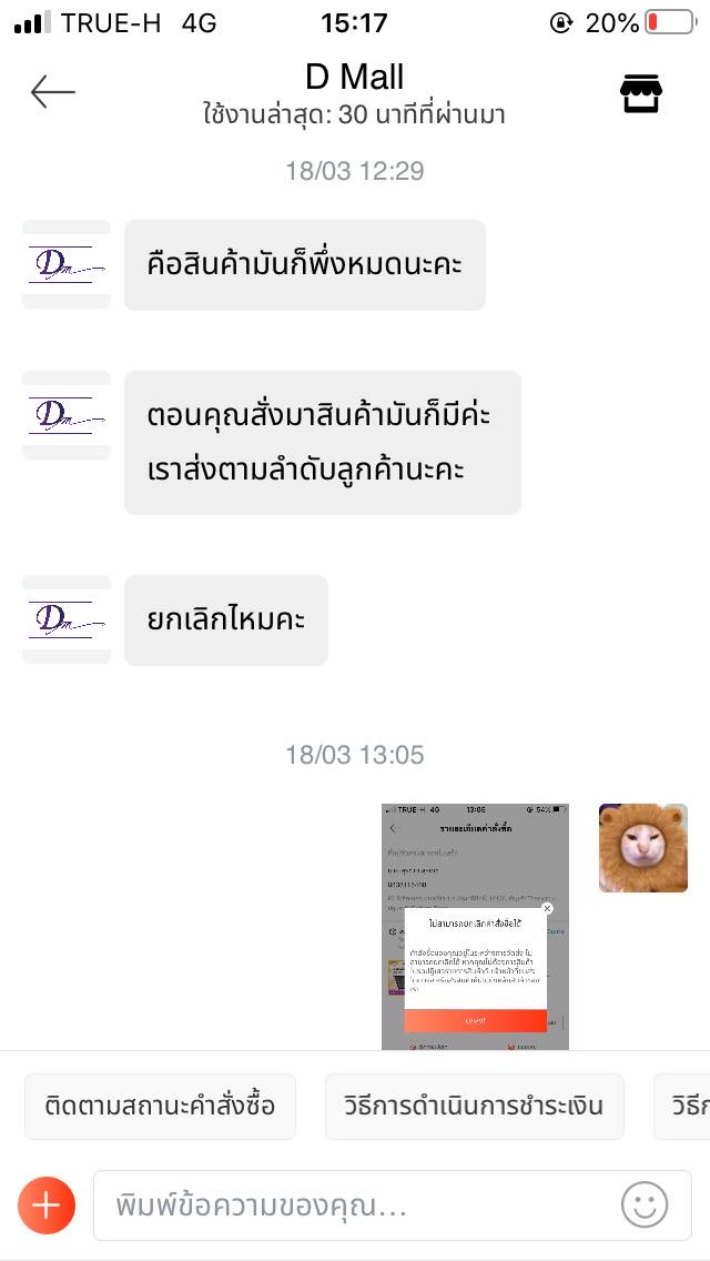 ร้านค้าตอบมาว่า สินค้ามันเพิ่งหมด ตอนที่คุณสั่งมันมีสินค้า เราส่งตามลำดับลูกค้า และร้านค้าถามกลับมาว่า ยกเลิกมั้ย