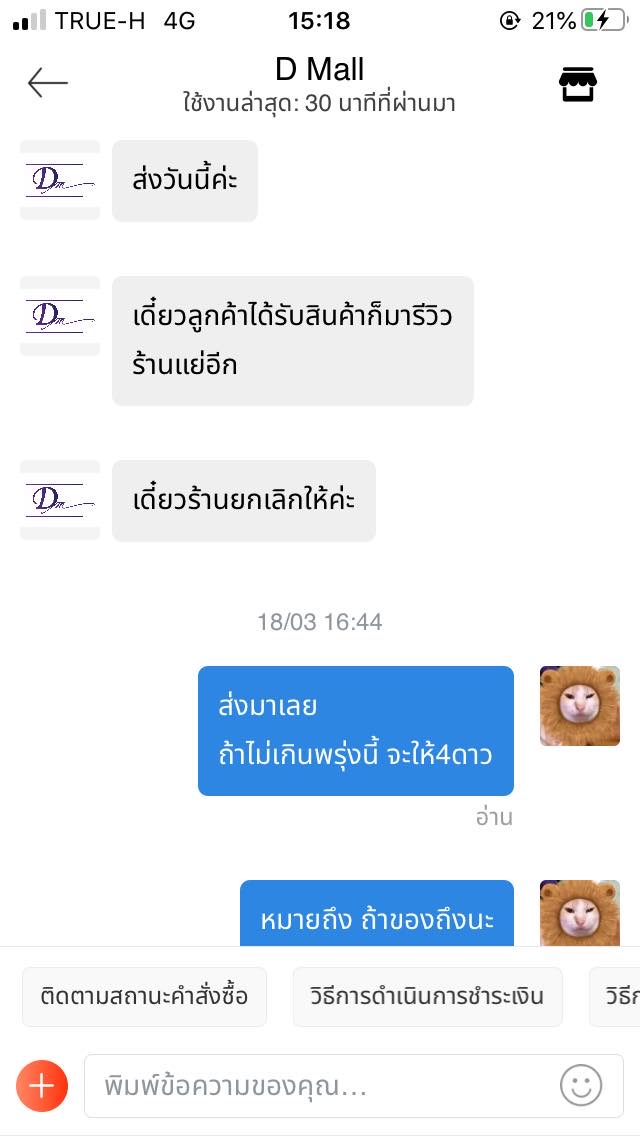 ร้านก็ตอบมาอีกว่า 'จะส่งวันนี้' กลัวลูกค้ารีวิวแย่
