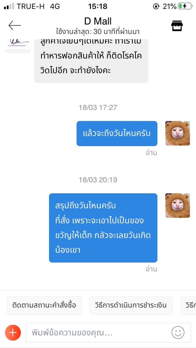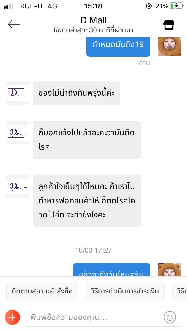 'ของไม่น่าถึงทันพรุ่งนี้' ''บอกแจ้งไปแล้วอะค่ะว่ามันติดโรค' (บอกตอนไหนว่ะ😑) ร้านพิมพ์มาต่อว่า 'ลูกค้าใจเย็นๆได้ไหมค่ะ ถ้าเราไม่ฟอกสินค้าให้ ก็ติดโควิดไปอีก จะทำยังไงค่ะ (โอเคมามุกโควิด🙄)
