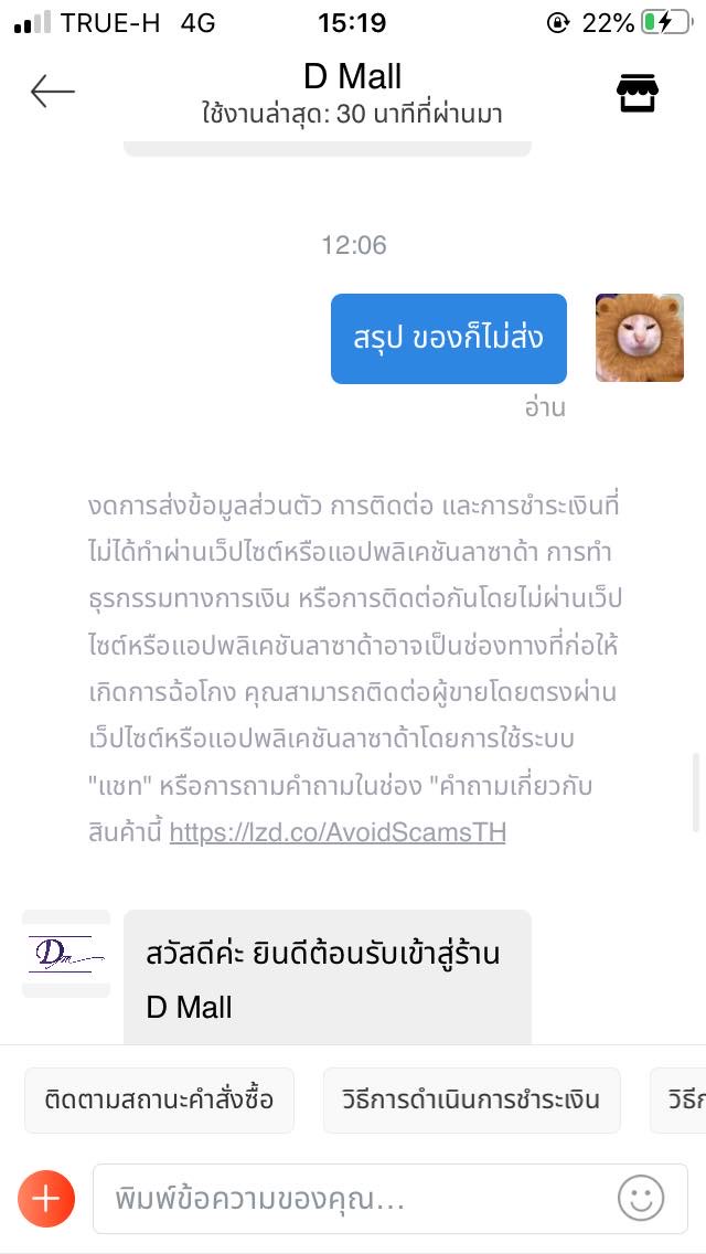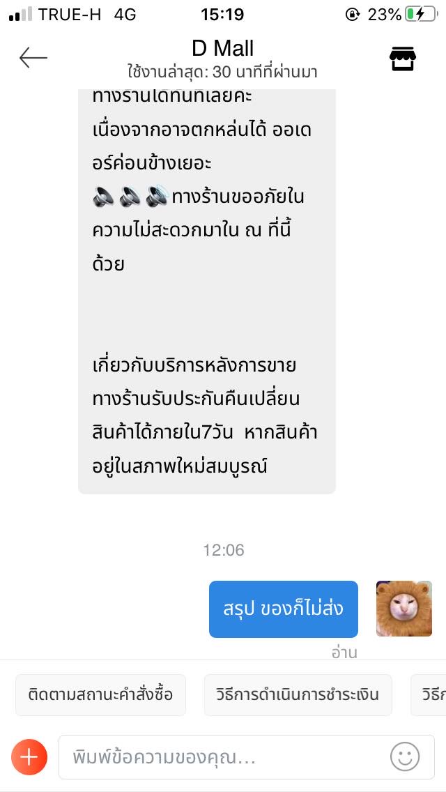 พอสุดท้าย วันจันทร์ประมาณเที่ยง ลองเช็คสถานะ ยังไม่ส่งเหมือนเดิม เลยพิมพ์ไปหาร้านว่า 'สรุป ก็ไม่ส่งของ'