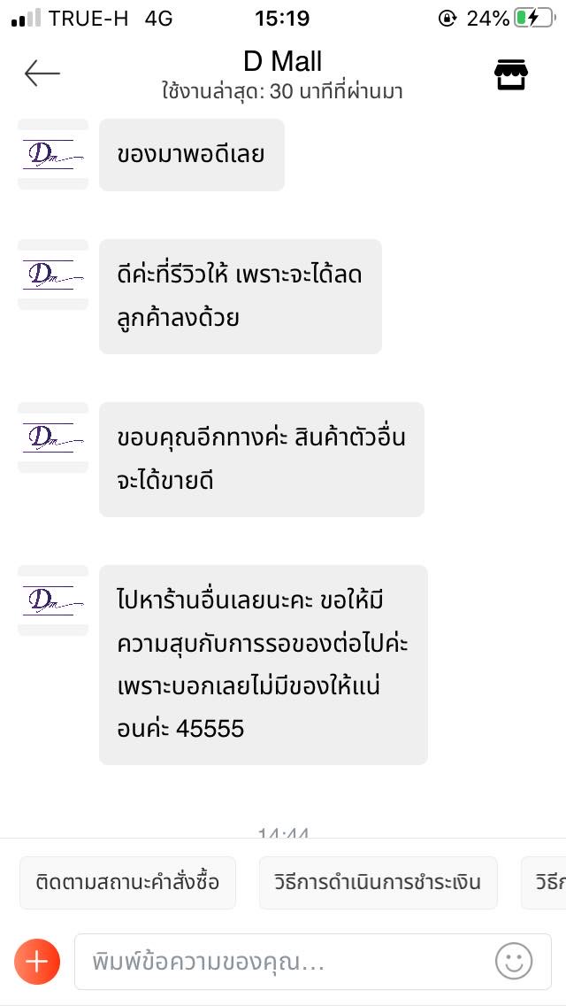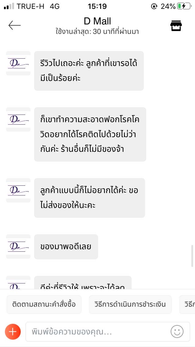 'ก็เขาทำความสะอาดฟอกโรคโควิด อยากได้โรคติดไปด้วยก็ไม่ว่ากันค่ะ ร้านอื่นก็ไม่มีของจ้า ' (มุกโควิดอีกแหละ แถมบอกร้านอื่นไม่มี🙄) 'ลูกค้าแบบนี้ก็ไม่อยากได้ ขอไม่ส่งของให้นะคะ' 'ของมาพอดีเลย' (แหมมมม ของมาอีกแหละ🤣🤣) 'ดีค่ะที่รีวิวให้ เพราะจะได้ลดลูกค้าลงด้วย' (อื้อหือ ช่างกล้า ) 'ขอบคุณค่ะ สินค้าอื่นจะได้ขายดี' 'ไปหาร้านอื่นเลยนะคะ ขอให้มีความสุขกับการรอของต่อไปค่ะ เพราะบอกเลยไม่มีของให้แน่นอนค่ะ 45555'