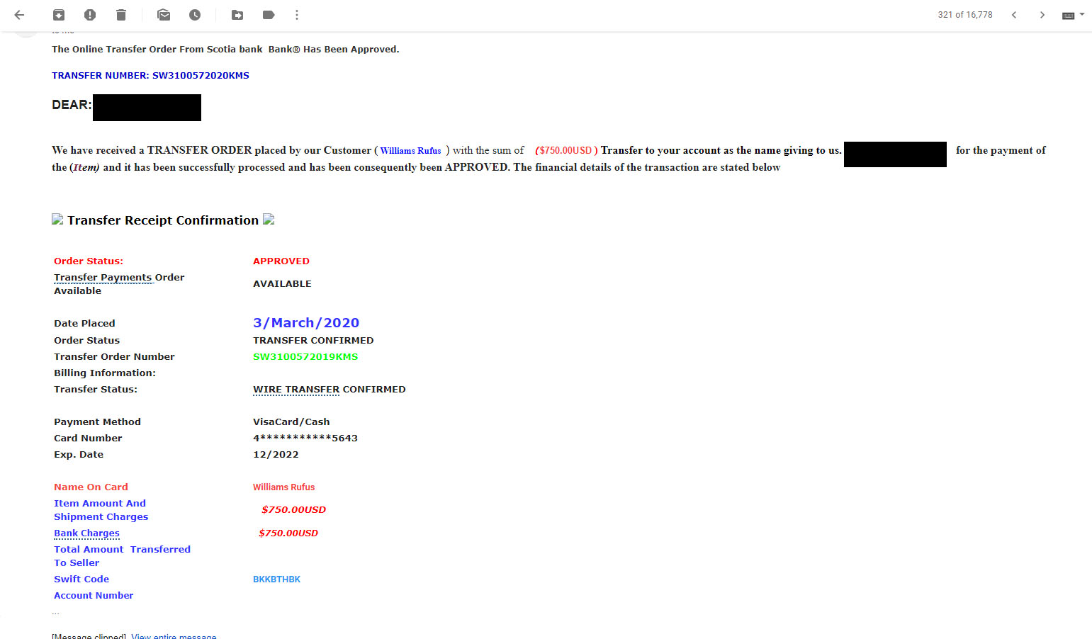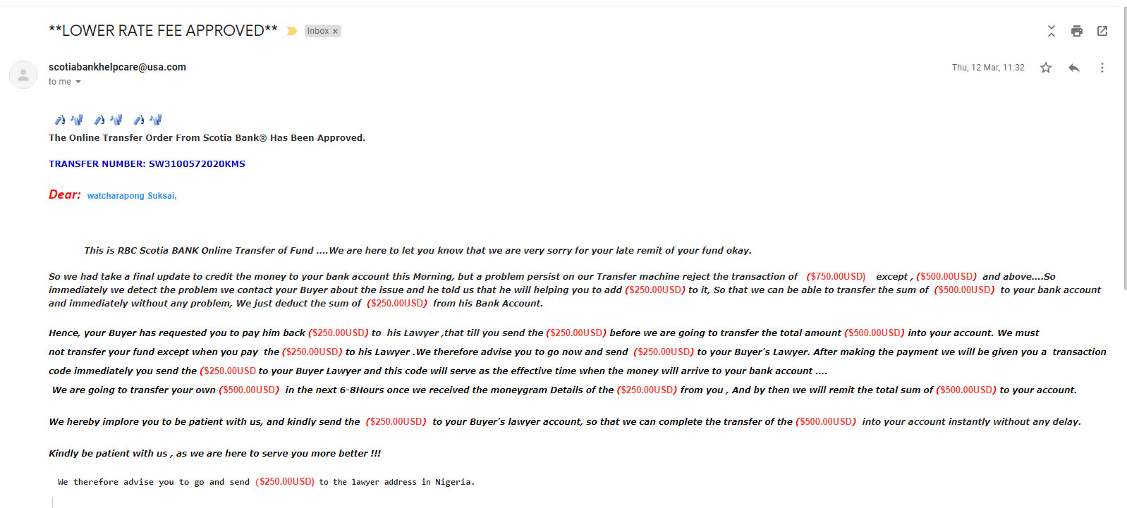 เสียค่าโง่ ปกติขายของใน ebay สำหรับขายของส่งต่างประเทศ สำหรับสินค้า ไอที ของมือสอง ของที่ไม่ได้ใช้ และได้ post ขายกล้องใน Kaidee อยู่ๆ มีชาวต่างชาติเด้งเข้ามาใน line มันบอกว่าคุณขายกล้องใน kaidee ใช่ไหม และฉันอยากได้ ให้คุณส่งของไปที่ US ตอนนี้ฉันทำธุรกิจอยู่ที่ เวียดนาม (แปลภาษาอังกฤษจับใจความได้ประมาณนี้ ไม่เก่งภาษาครับ ใช้ translate) ด้วยอยากได้เงินเป็นค่าใช้จ่าย จึงตอบตกลงและมันให้ราคาดี มันบอกให้ส่งพรุ่งนี้เลย มันต้องการด่วน และมันโอนเงินให้แล้วแต่เงินยังไม่เข้า ส่งหลักฐาน มาให้ดูทาง อีเมล์