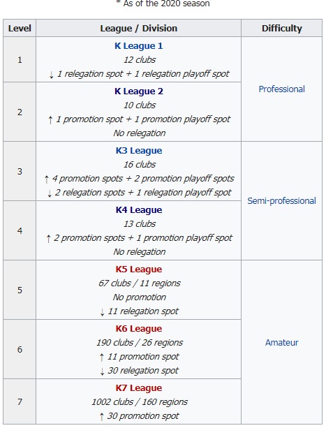 สังเกตุลีกเกาหลีใต้มีการแยกระดับลีกกันแบบชัดเจนเหมือน ญี่ปุ่น และ ยุโรป ทำคือ ลีกอาชีพ ลีกกึ่งอาชีพ ลีกสมัครเล่น
