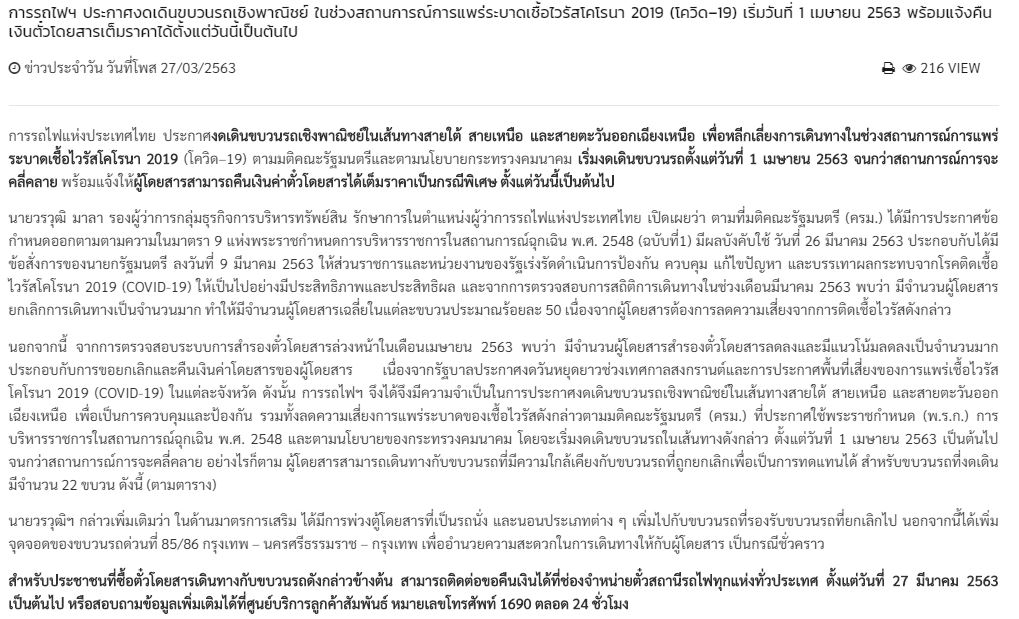 การรถไฟฯ ประกาศงดเดินขบวนรถเชิงพาณิชย์ ในช่วงสถานการณ์การแพร่ระบาดเชื้อไวรัสโคโรนา 2019 (โควิด–19) เริ่มวันที่ 1 เมษายน 2563 พร้อมแจ้งคืนเงินตั๋วโดยสารเต็มราคาได้ตั้งแต่วันนี้เป็นต้นไป