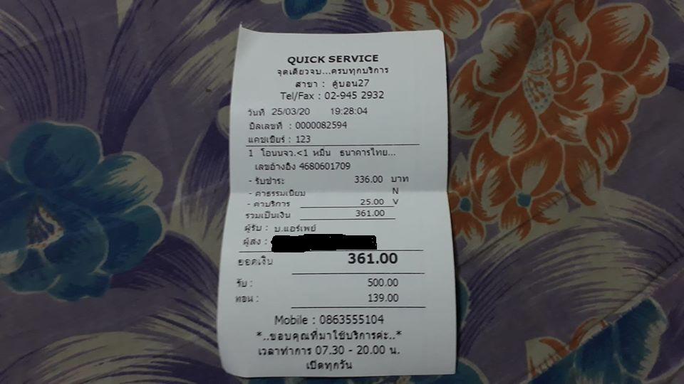 2.ไปโอนเงินตอน 19.28 น. ของวันที่ 25 มีนาคม โดยโอนเงินผ่าน ร้านเคาท์เตอร์เซอวิส ที่รับโอนเงินทุกธนาคาร (มีสลิปใบเสร็จ หลักฐานเรียบร้อย)