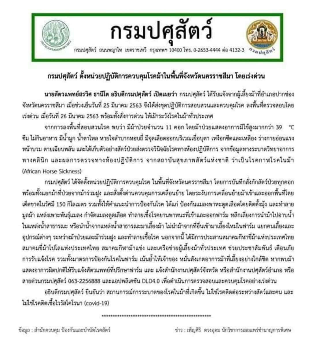 มีข่าวส่งต่อมาค่ะ เรื่องด่วนครับ//สันนิษฐานว่าเป็น โรค African horse sickness ระบาดที่สระบุรี-ปากช่อง //ติดต่อมาจากม้าลาย/อูฐ (ก่อนหน้านี้มีบริษัท/สวนสัตว์เอกชนรายใหญ่/นำเข้าล็อตใหญ่/ตาย...หลายตัว/ไม่ระบุ_?)//มีแมลงเป็นพาหะ พบอัตราการตายสูงในม้า ~>70% ____สวนสัตว์ใกล้เคียง(โคราช/ขอนแก่น/อุบล/ชลบุรี) โปรดเฝ้าระวังด้วยครับ//