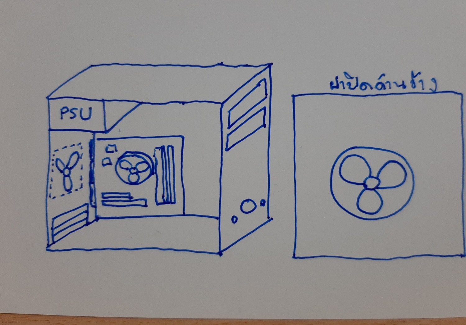 ส่วนกล่อง PSU อยู่ด้านบน ตัวกล่องหันด้านพัดลมลงล่าง ต้องให้พัดลมเป่าเข้ากล่องหรือดูดออกจากกล่องครับ