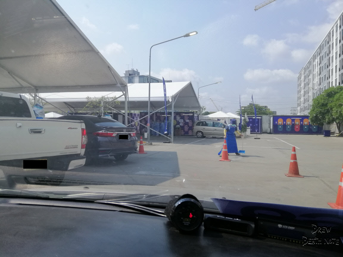 ผมมาถึง รพ. ประมาณ 10 โมงกว่าครับ สถานที่ตรวจเป็นเหมือนเต๊น outdoor ใหญ่ๆ 2 เต๊น อยู่ลึกเข้าไปด้านในสุดของลานจอดรถของ รพ. เลยครับ มาถึงก็เข้าคิวก่อน จำนวนรถที่เข้ามาไม่มากครับ ต้องรอประมาณ 2 คิว ก็แปปเดียว..