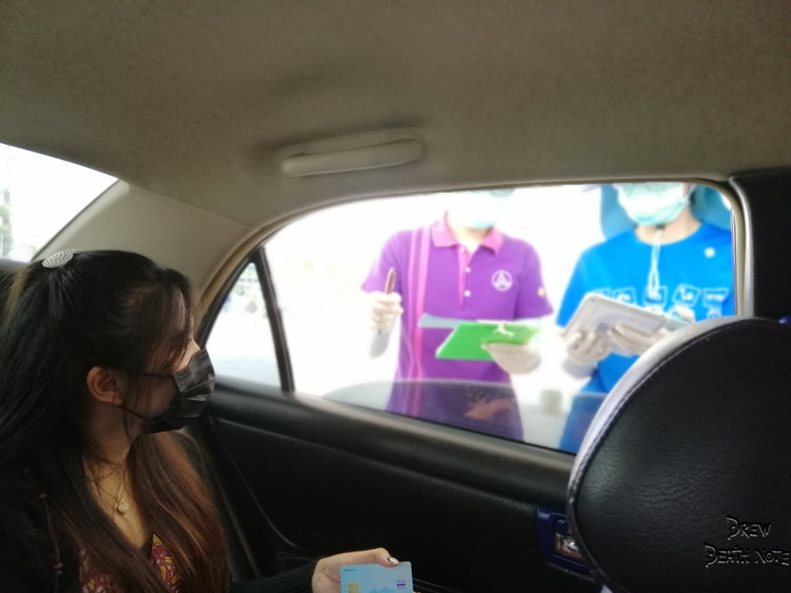 ขั้นตอนแรก - คัดกรอง ทำการตรวจวัดไข้ และตรวจสอบข้อมูลการสมัคร โดยใช้หลักฐานคือบัตรประชาชนครับ ไม่ต้องลงจากรถ ไม่มีการโดนตัวกัน และไม่ต้องส่งต่อหรือจับต้องบัตรประชาชนเลย เราแค่ยื่นให้เขาดูจากในรถครับ แล้วขับรถต่อไป