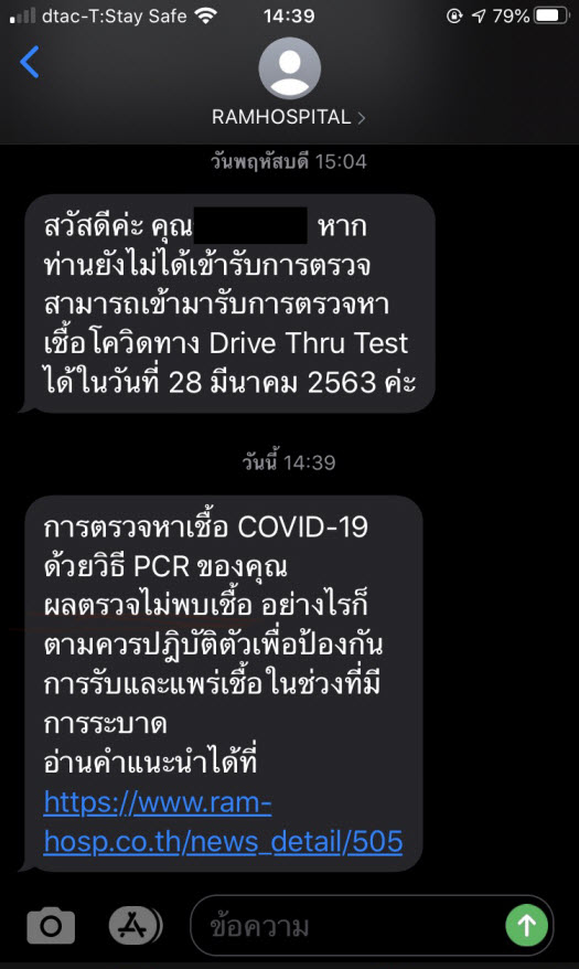 หลังจากที่เข้าตรวจเชื้อเมื่อวาน (28 มีนา 2563) ก่อนเที่ยง วันนี้ (29 มีนา 2563) ช่วงบ่าย ทาง รพ. ก็ได้ส่งผลตรวจมาทาง SMS ยืนยันแล้วว่าไม่ติดเชื้อ ดังรูปด้านล่างนี้ครับ ทั้งๆที่อาการทุกอย่างทำให้คิดว่าน่าจะเป็น แต่พอตรวจแล้วก็สบายใจครับ..