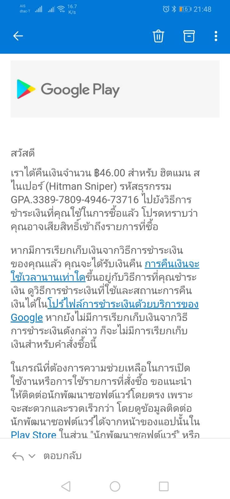 เนื่องจากผมได้ซื้อแอปๆนึงใน google play โดยชำระผ่าน airpay wallet แต่สักพัก เปลี่ยนใจจึงขอคืนเงินกับ Google play ซึ่ง google ก็อนุมัติแล้วตามภาพ