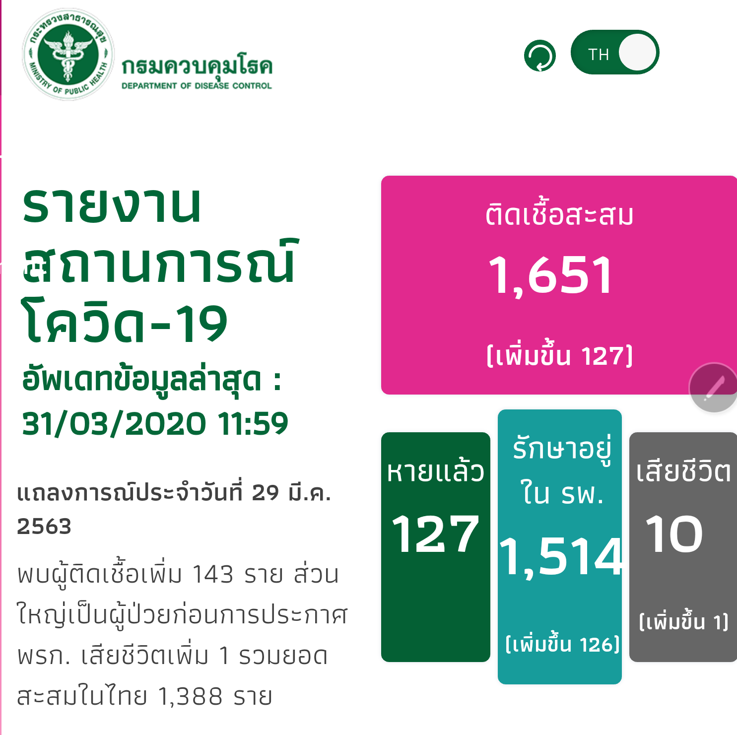 31 มี.ค.63- ศูนย์บริหารสถานการณ์โควิด-19 (ศบค.) โดยนพ.ทวีศิลป์ วิษณุโยธิน โฆษกกระทรวงสาธารณสุขแถลงสถานการณ์การระบาดไวรัสโควิด-19 ประจำวันที่ 31 มีนาคมว่า มีผู้ติดเชื้อเพิ่ม 127 คน สะสม 1,651 เสียชีวิตเพิ่มอีก 1 คน เป็นชายไทยวัย 48 ปี อาชีพนักดนตรี มีโรคประจำตัวเบาหวานและมะเร็ง