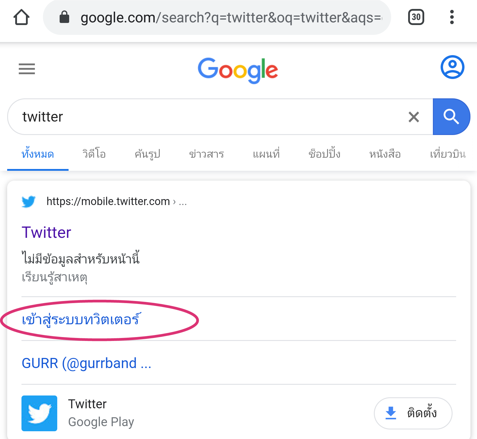1. คีย์คำว่า twitter ลงในกูเกิ้ล