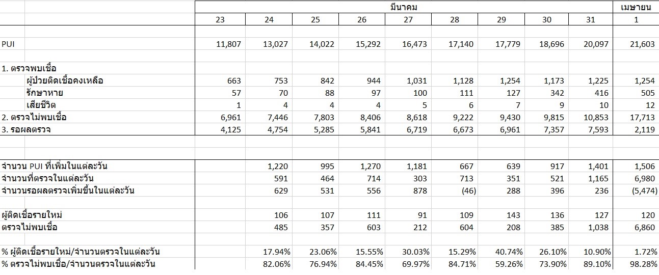 - วันที่ 1 เมษายน มีการตรวจเชื้อทั้งสิ้น 6,980 ราย พบเชื้อ 120 ราย ไม่พบเชื้อ 6,860 ราย จำนวน PUI รอผลตรวจลดลงจาก 7,593 รายเหลือเพียง 2,119 รายภายใน 1 วัน