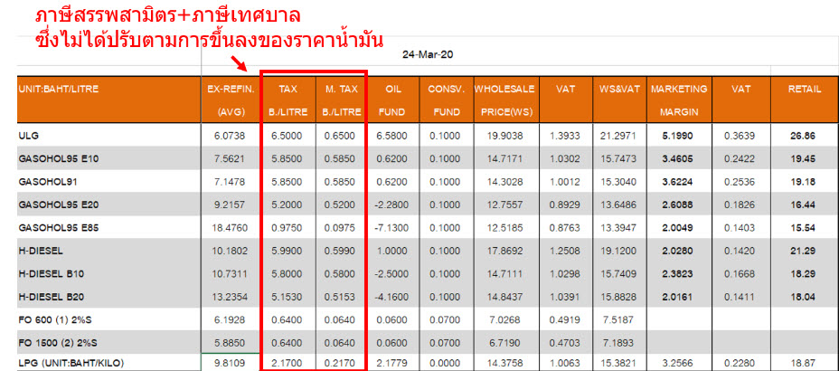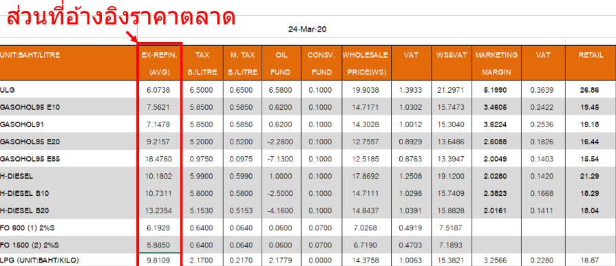แน่นอนว่า ราคาหน้าโรงกลั่นเป็นส่วนที่อ้างอิงมาจากราคาตลาดโดยตรง แต่ในนั้นยังมีบางค่าที่ไม่ได้ปรับตามราคาตลาด อาทิ