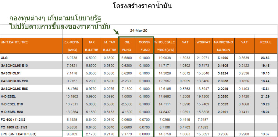 – กองทุนน้ำมัน … ในส่วนนี้รัฐเป็นคนกำหนดนโยบายเรื่องการจัดเก็บกองทุนฯ ทั้งหมด ทั้งกองทุนน้ำมันเชื้อเพลิงและกองทุนอนุรักษ์พลังงาน ซึ่งบางตัวรัฐก็จัดเก็บ บางตัวรัฐก็เอาเงินมาช่วยอุดหนุนราคา (เช่น แก๊สโซฮอล E20 และ E85 หรือ ดีเซล B10 และ B20) ดังนั้นกองทุนส่วนนี้จึงไม่ได้ปรับขึ้นลงตามราคาน้ำมัน นอกจากรัฐจะมีการปรับเปลี่ยนนโยบาย