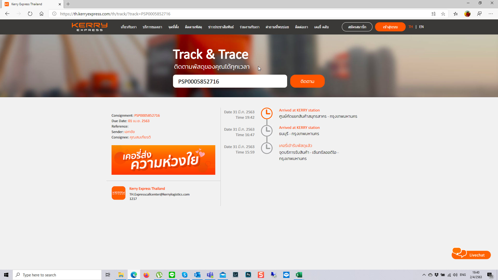 วันนี้ 2 เม.ย. 63 เวลาประมาณ 14:30 โทร. ไปที่ Kerry Cell Center ซึ่งได้คำตอบว่า... ของยังอยู่จุดกระจายต้นทางอยู่เลย และยังไม่สามารถให้คำได้ว่า "ของจะถึงปลายทางเมื่อไหร่"