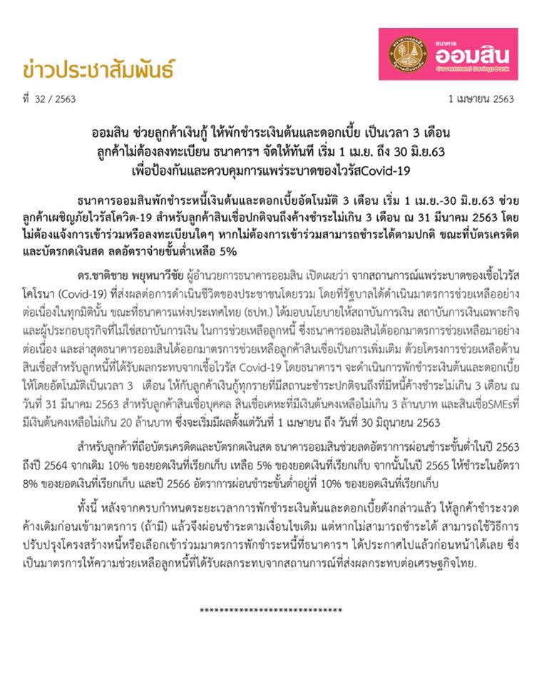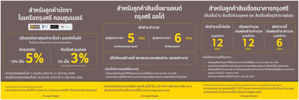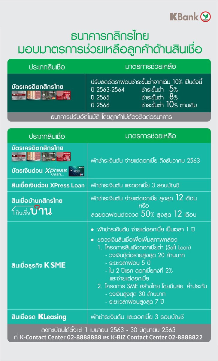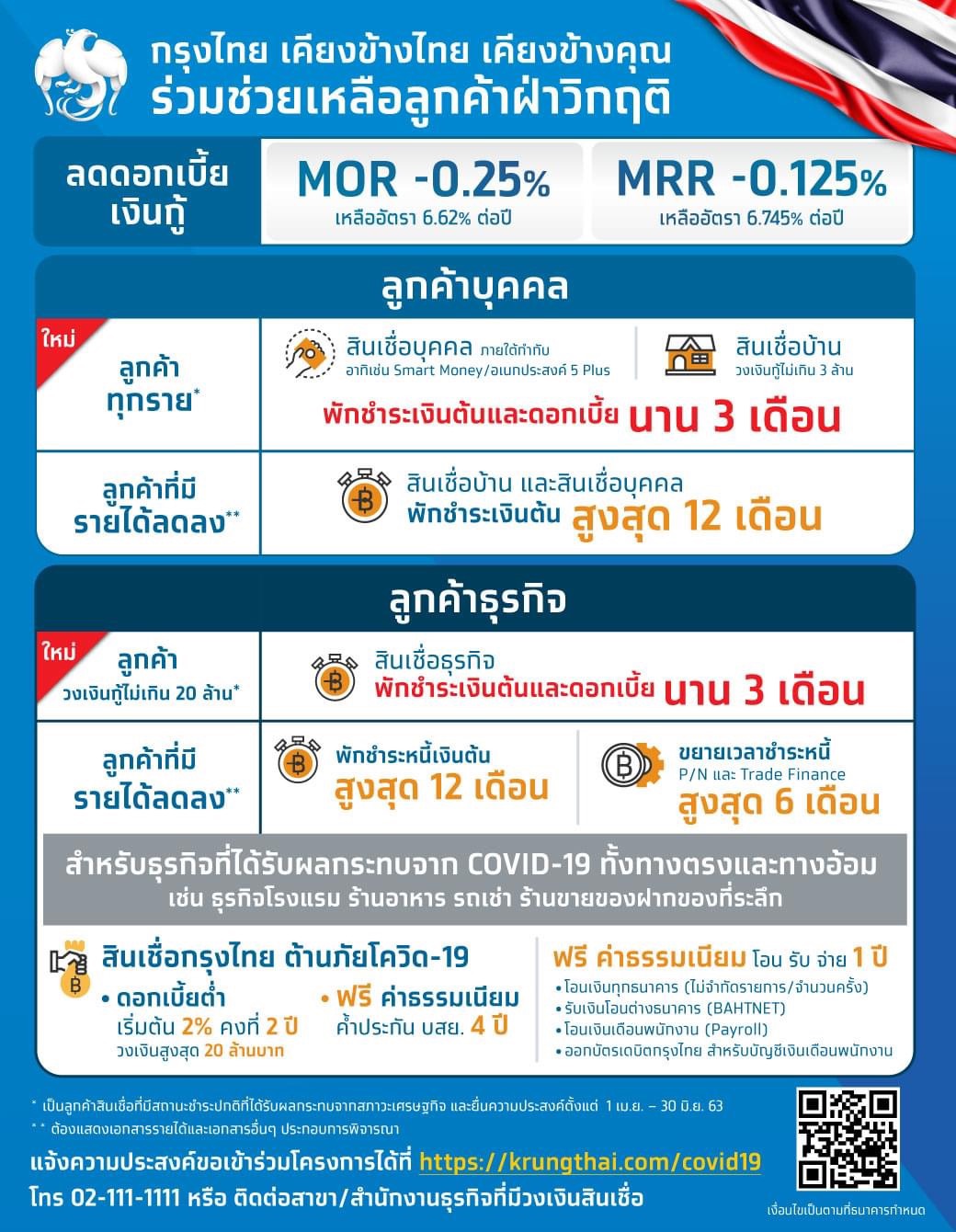ในสถานะการณ์ที่เกิดช่วงโควิด-19 ระบาดไปทั่วแต่ละธนาคารได้มีมาตรการช่วยเหลือลูกหนี้โดยการลดย่อนภาษี ยืดระยะเวลาชำระหนี้ออกไปรวมทั้งพักการชำระหนี้ ซึ่งในแต่ละธนาคารก็มีมาตรการที่ต่างกันทางเราจึงรวบรวมมาให้ มีมาตรการดังนี้