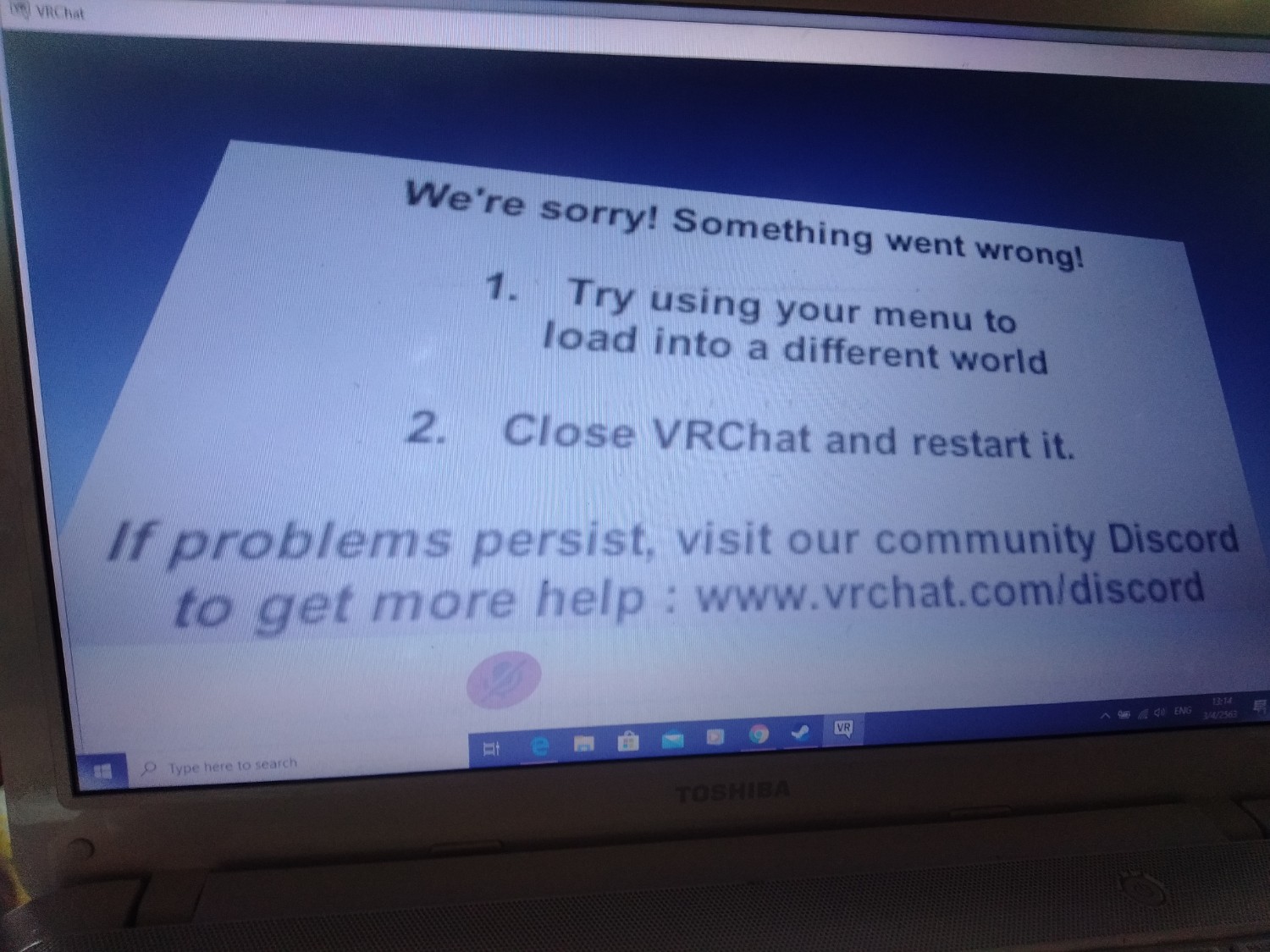 เข้าโลกอื่นไม่ได้ในvrChatมันเป็นเพราะอะไรหรอคับผมพึ่งมาเป็นวันี้แต่ก่อนเล่นได้ปกติ