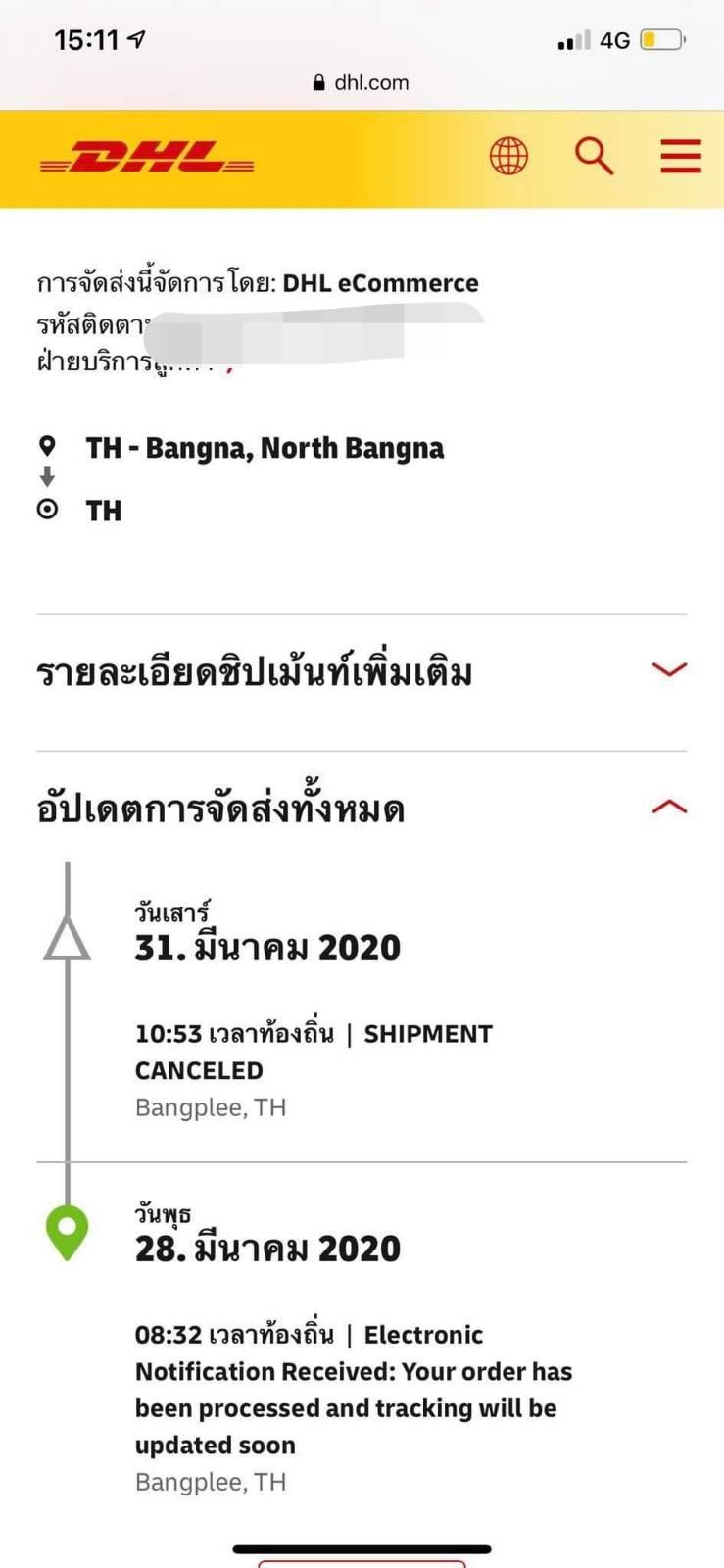 โทรไปถามDHL บอกว่าร้านค้าจากทางshopeeเป็นกดยกเลิกการขนส่งกลางคัน