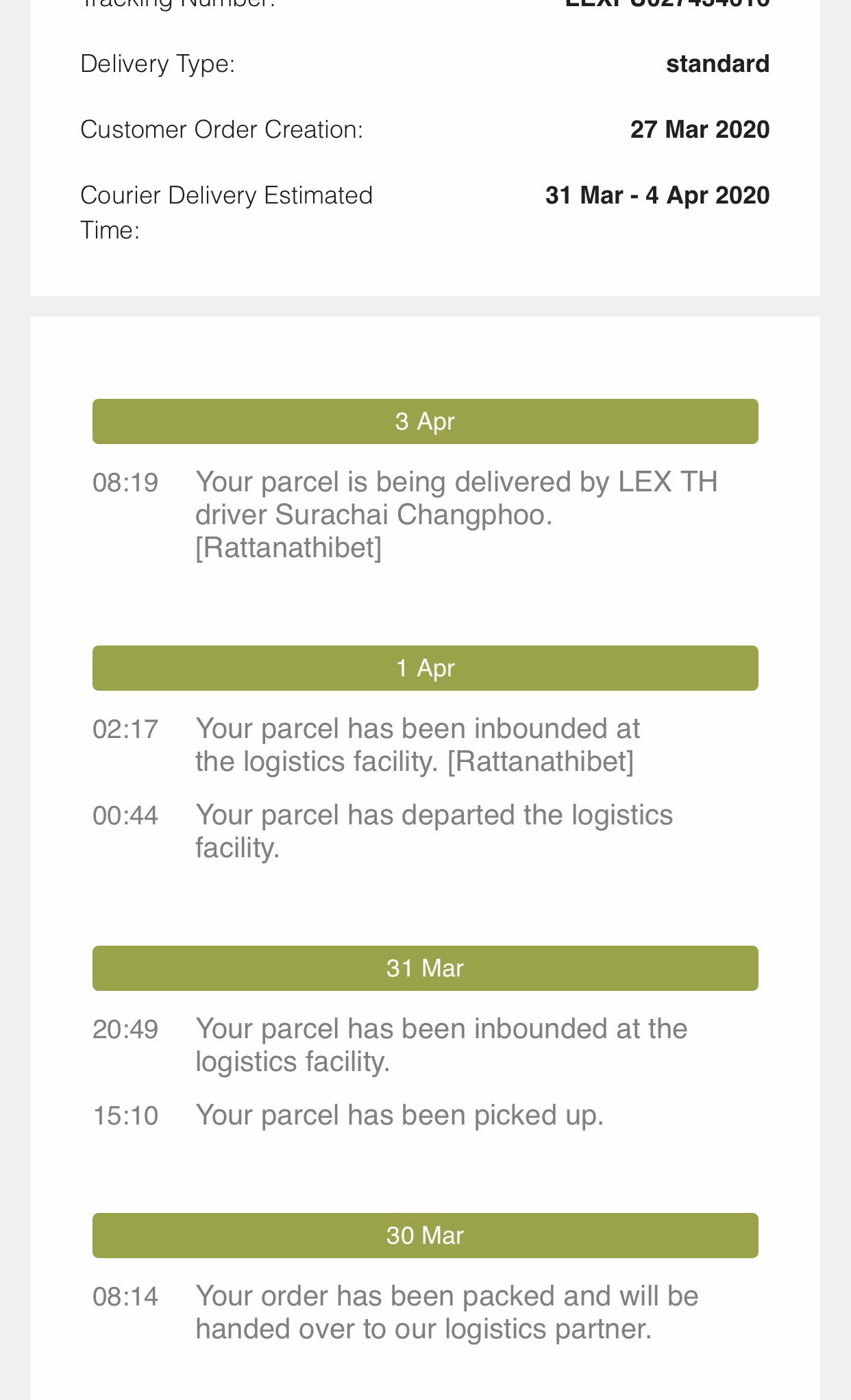 ส่งของช้ามากๆเลยครับ สั่งของไปตั้งแต่วันที่27 ในแอปบอกส่งของถึงวันที่31มีนา-4เมษา จนตอนนี้จะหมดวันยังไม่ได้ของเลย พอโทรไปถามว่าวันนี้ของจะถึงไหม ก็มีแต่ขอโทษในความล่าช้า และให้เรารออย่างเดียว ไม่รู้ทางsupportจะติดตามให้เรารึเปล่าไม่รู้ช้ามาก และมีการบอกว่าถ้าส่งพน.ไม่ทัน ให้เรารอวันจันทร์อีก โคตรไม่มีความมาตรฐานในการส่งให้ตรงเวลาเลย ช้ามากๆเลย