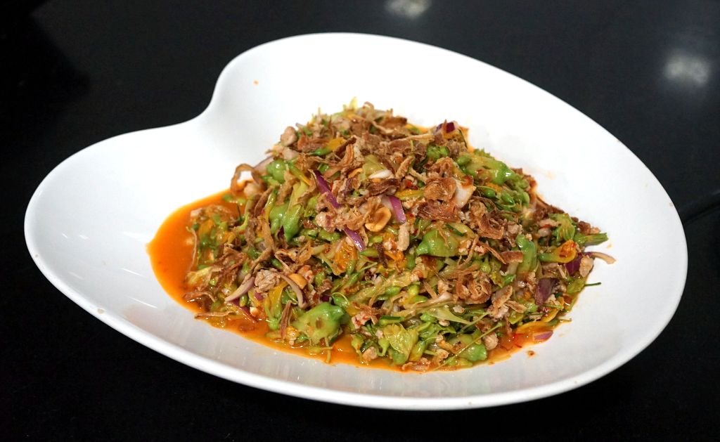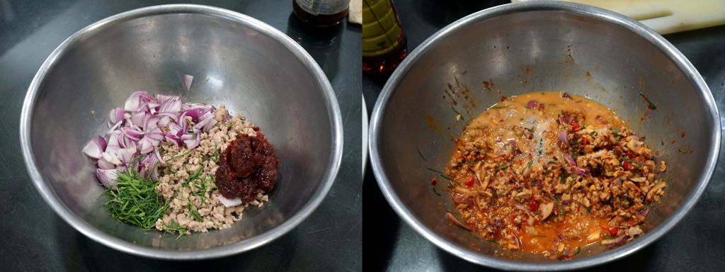 ยำใส่ หมูสับที่รวนให้สุก ใบมะกรูด หอมแขก น้ำพริกเผา พริกขี้หนู และ หัวกะทิ ปรุงรสด้วย น้ำปลา มะนาว