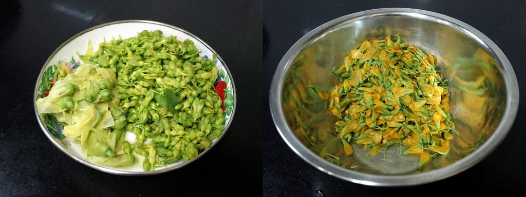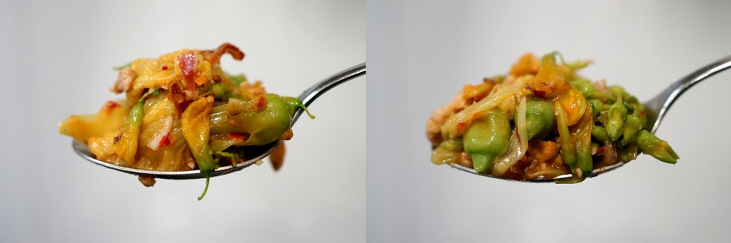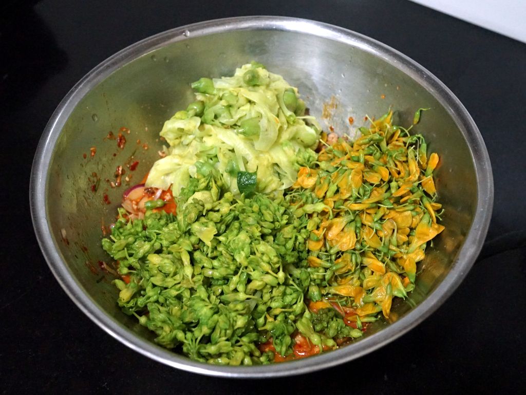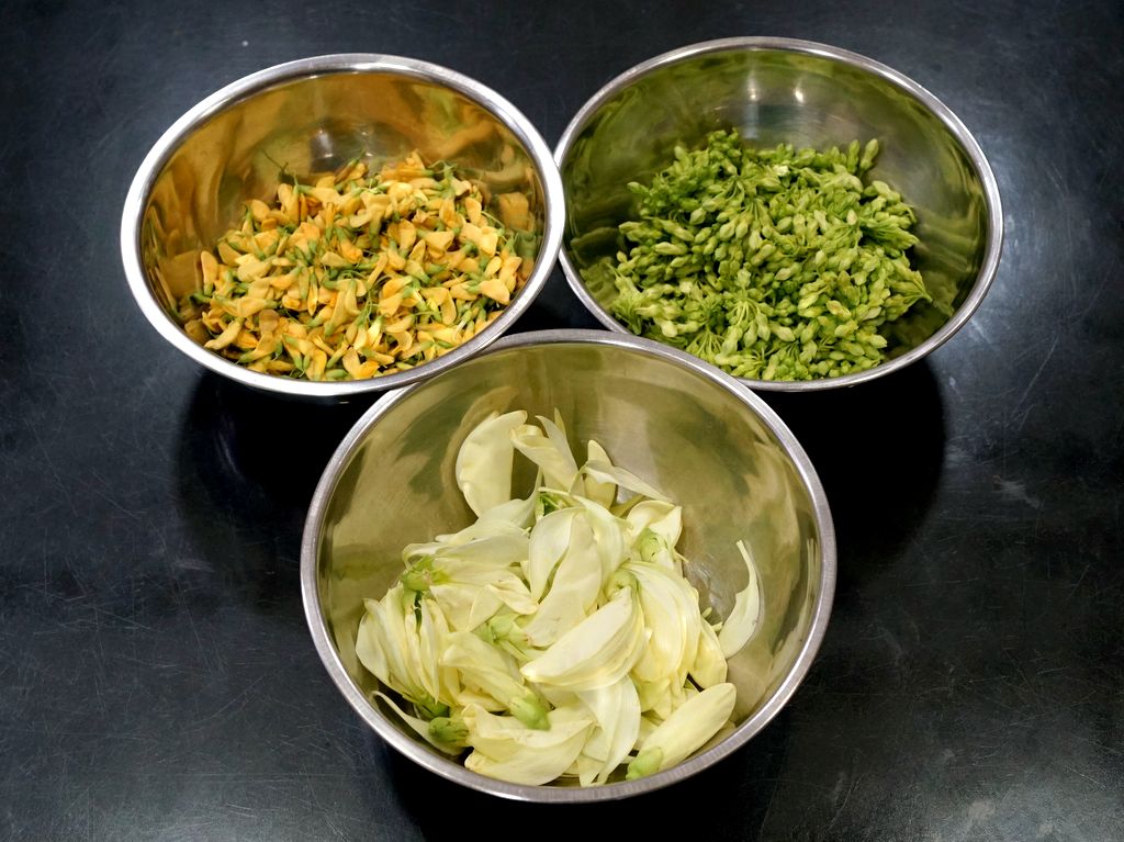 ซื้อดอกไม้ 3 ชนิด ได้แก่ ดอกโสน ดอกขจร และ ดอกแค นำมาทำยำใส่หมูสับ น้ำพริกเผา และ หัวกะทิ