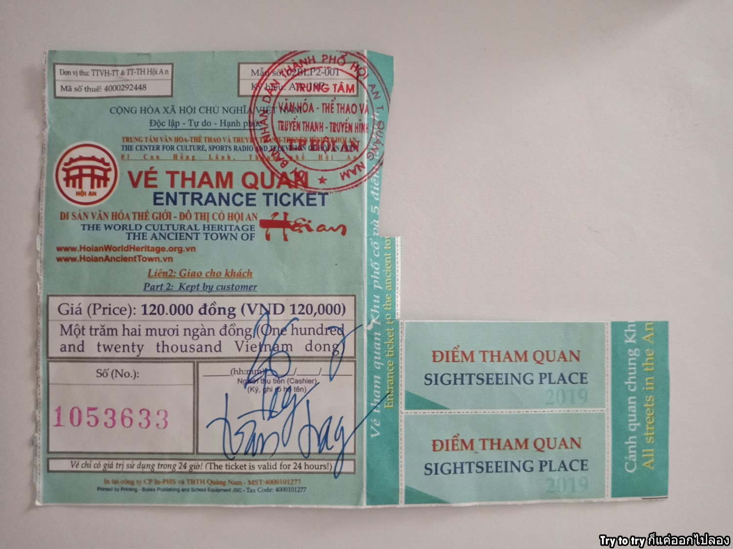 พอเราผ่านซอยน้ำท่วมนั้นมาได้ เราก็จะเจอกับสะพานฮอยอัน ซึ่งตรงตีนสะพานมันจะมีจุดขายตั๋วเข้าเมืองเก่าด้วย ตรงนี้เราไม่จำเป็นต้องซื้อตั๋วเข้าก็ได้นะ มันจะเป็นตั๋วเหมาๆ เข้าชมสถานที่ต่างๆ 5 ที่ ราคา 120.000 VND ถ้าคิดว่าตัวเองจะเข้าครบก็ซื้อมาเถอะ แต่เราก็เข้าไม่ครบหรอก ไม่น่าซื้อมาเลยเปลืองเงินเปล่าๆ แล้วตรงที่ขายตั๋วทุกจุดเราสามารถแลกเงินได้ด้วยนะ อันนี้ดีงาม เรทก็ไม่โหดร้ายนะ เราแลกไปพันนึงได้มาประมาณ 769.000 VND ซึ่งเป็นเรทจริงๆ ของวันนั้นเลย ดีงามมมม >///<