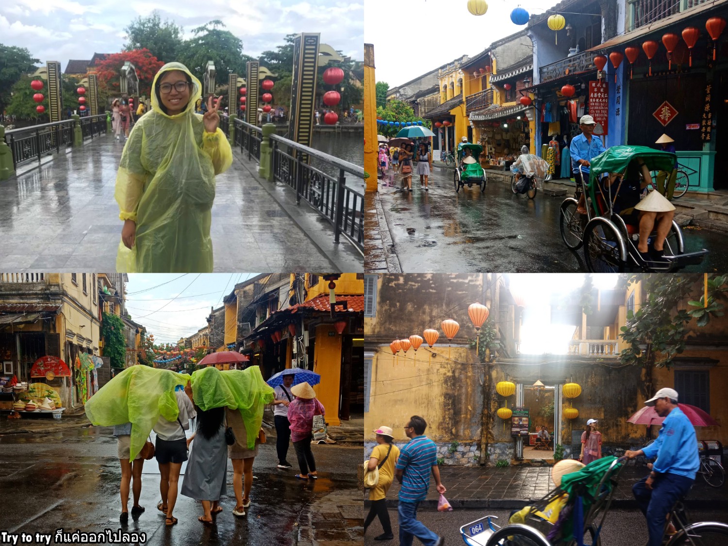 ใส่เสื้อกันฝนเสร็จก็เดินไปจนสุดสะพานฮอยอันมันจะมีทางแยกอยู่สี่ทาง เลยถามเพื่อนว่า "ไปทางไหนก่อนดี" เพื่อนก็เลยชวนเดินไปทางขวาสุดริมแม่น้ำทูโบนก่อน คือระหว่างนั้นฝนมันก็ยังตกอยู่ ทุกคนเขาดูสู้กันมาก 555555 ไม่กลัวฝนกันเลย คนจะเดินก็เดินกันไป รถซิโคว่จะปั่นก็ปั่นกันไป สุดยอดมากกก วิวเมืองเก่าตอนฝนตกเป็นอะไรที่สวยโรแมนติก แล้วก็มีเสน่ห์มากๆ