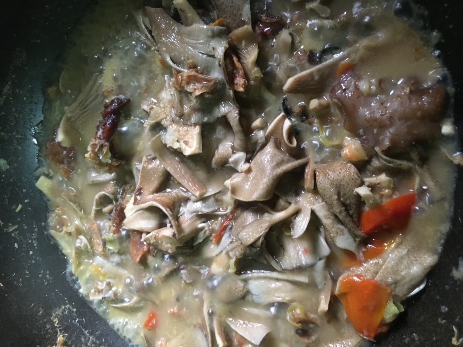 เนื่องจากเห็นค่อนข้างเหนียว จึงต้องตั้งไฟนานหน่อยครับ คอยชิมไปเรื่อย ๆ ว่าเห็ดสุกหรือยัง