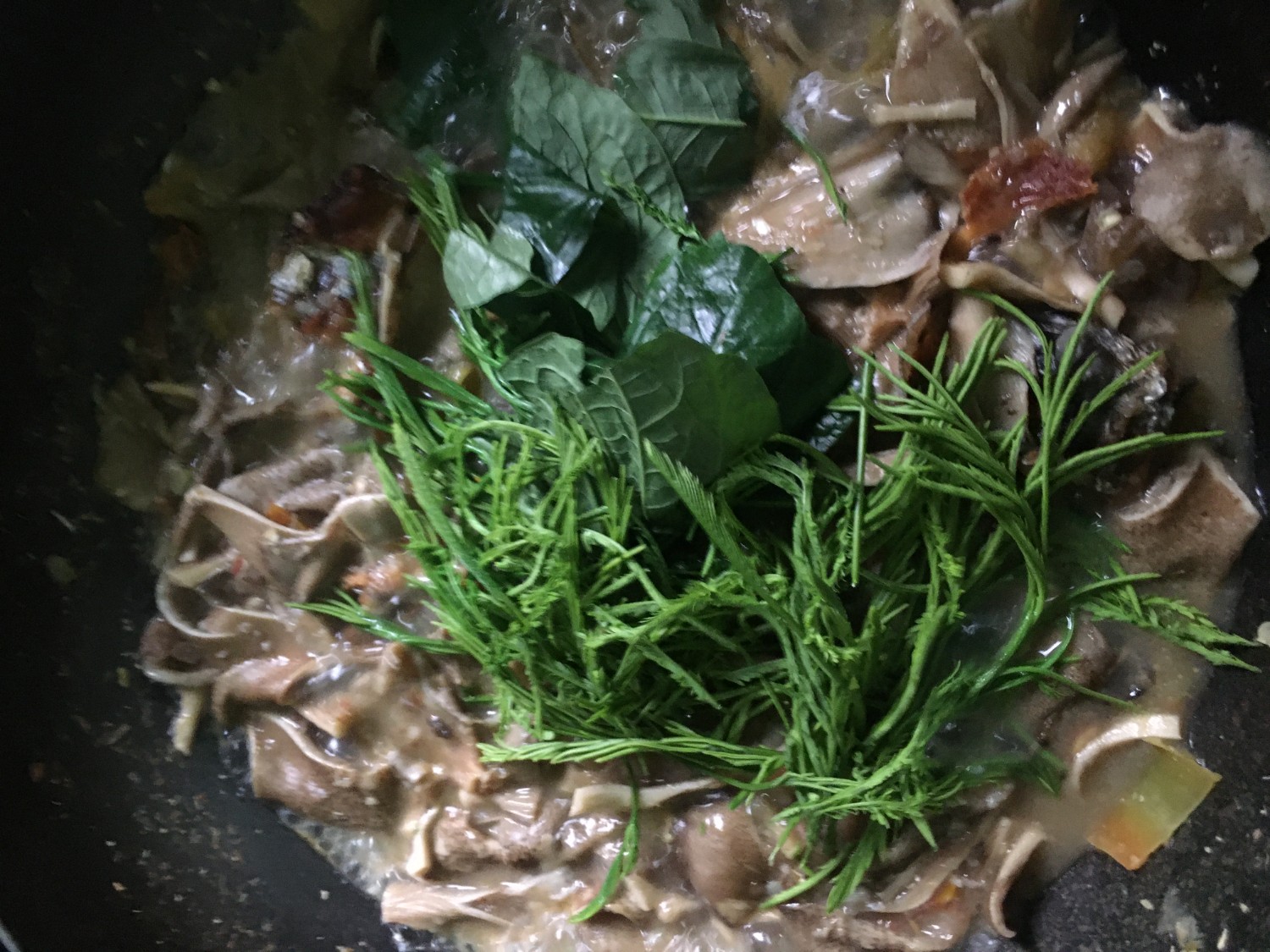 เมื่อเห็ดสุกดีแล้ว ใส่ชะอมกับชะพลูลงไป ปิดแก๊สได้ครับ