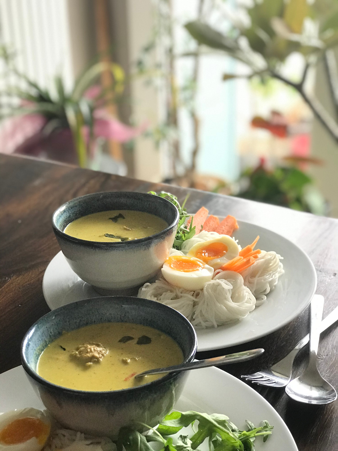 น้ำยาทูน่าประยุกต์แทนน้ำยาปูที่ชื่นชอบ เพราะปูที่นี่หายากและถึงมีก็แพงมากและกินไม่หนำใจเหมือนอยู่ที่เมืองไทย