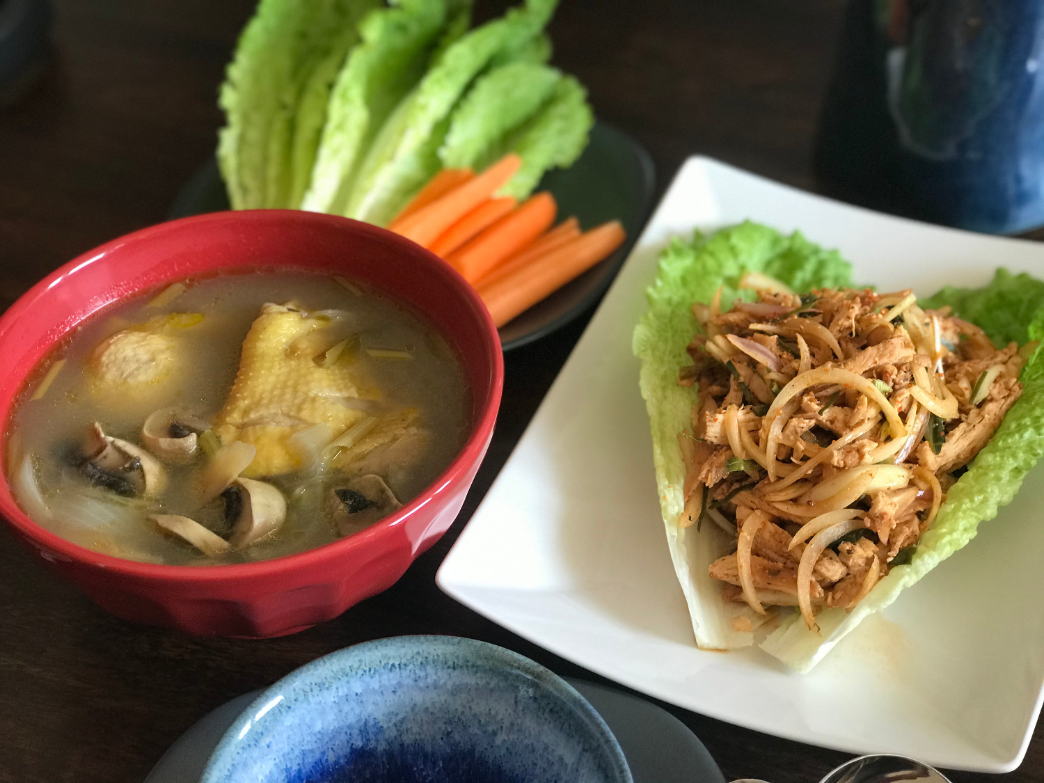 เมนูนี้ทำเหมือนต้มข่าไก่ แต่ไม่ใส่กะทิ ใส่พริกเพิ่มหน่อยให้ได้รสชาติจัดขึ้น ส่วนลาบไก่นี่เจี๊ยบหมักไก่และย่างไก่ก่อนแล้วค่อยเอามาทำลาบอีกที ชอบกินแบบรสจัดจ้านก็ใส่มะนาว น้ำปลา พริกได้ตามที่ต้องการ